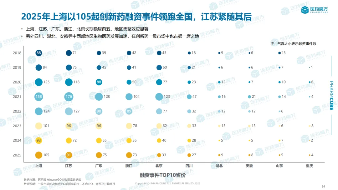 按地区看,医药产业集聚效应显著,上海、江苏、广东、浙江、北京创新药企融资事件和金额长期稳居前五,2025年,上海以105起创新药融资事件领跑全国,融资金额达到15.19亿美元,江苏紧随其后。