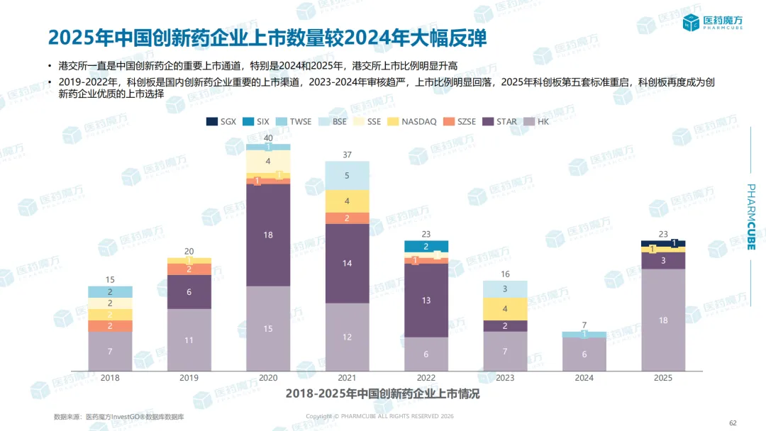 2020-2021年,中国创新药企上市活跃,2022年开始,上市企业数量快速下降,2024年仅7家企业上市。2025年上市企业有明显反弹,达到23家,大部分企业在港交所上市。