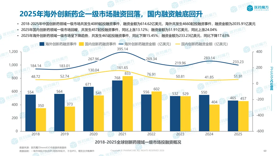 2018-2025年中国创新药领域一级市场共发生4089起投融资事件(IPO前融资轮次),融资金额为614.62亿美元,海外共发生4660起投融资事件,融资金额为2035.91亿美元。2025年国内创新药领域一级市场回暖,共发生457起投融资事件,同比上涨13.12%;融资金额为51.91亿美元,同比上涨24.04%,呈现触底回升态势。2025年海外创新药领域一级市场呈下降趋势,共发生465起投融资事件,同比下降15.45%;融资金额为233.23亿美元,同比下降17.63%。