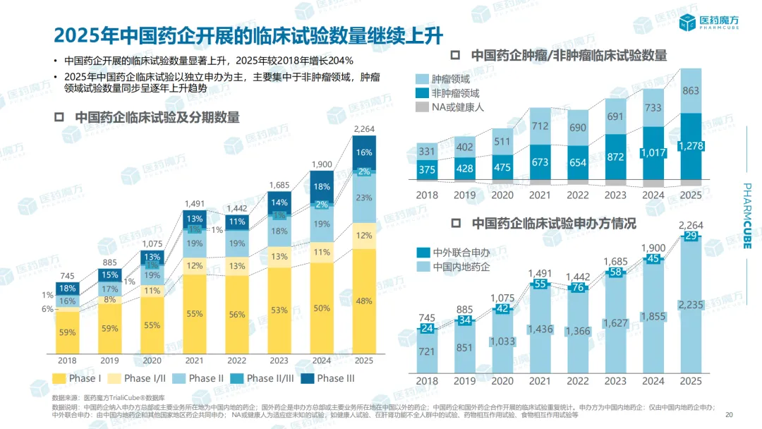 2025年中国药企开展的临床试验数量继续上升,达到2264项,较2018年增长204%。中国药企临床试验以独立申办为主,非肿瘤领域临床试验数量相对较多,2025年有1278项,肿瘤领域有863项。中国药企开展的MRCT数量呈增长趋势,但其占全部临床试验的比例依旧偏低,2025