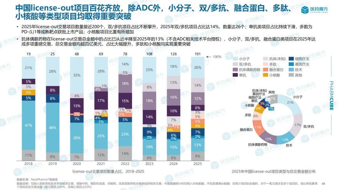 2025年license-out交易项目数量接近200个,双/多抗项目占比不断攀升,2025年双/多抗项目占比达14%,数量达26个;单抗类项目占比持续下滑,多数为PD-(L)1等成熟靶点获批上市产品;小核酸项目比重有所增加。抗体偶联药物在license-out交易总金额中的占比已从近半降至2025年的13%(不含ADC相关技术平台授权),小分子、双/多抗、融合蛋白类项目在2025年达成多项重磅交易,总交易金额均超百亿美元,占比大幅提升,多肽和小核酸均实现重要突破。