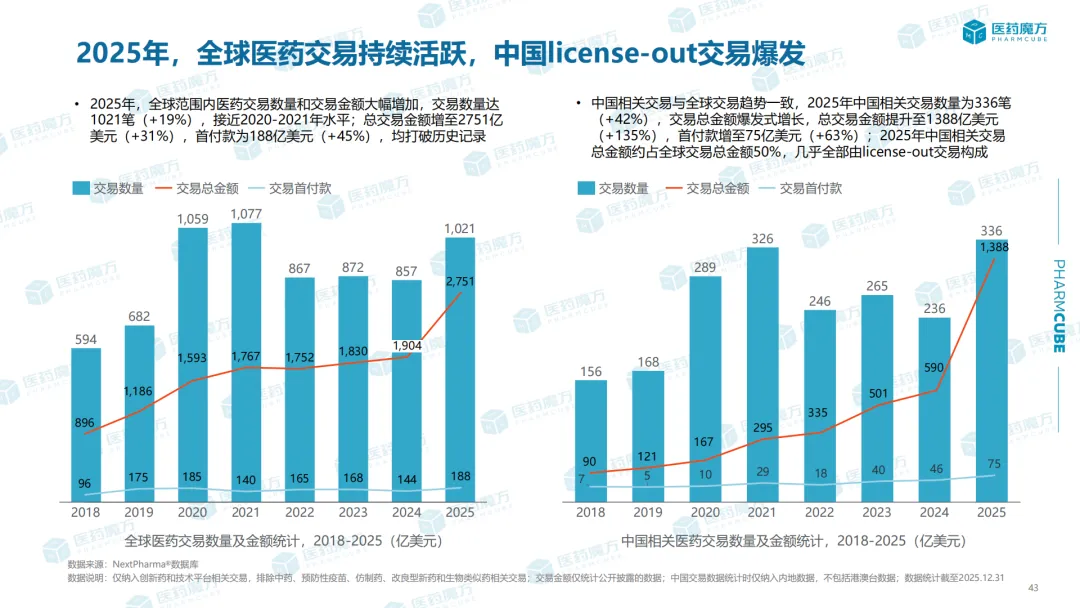 2025年,全球范围内医药交易数量和交易金额大幅增加,交易数量达1021笔(+19%),接近2020-2021年水平;总交易金额增至2751亿美元(+31%),首付款为188亿美元(+45%),均打破历史纪录。中国相关交易与全球交易趋势一致,2025年中国相关交易数量为336笔(+42%),交易总金额爆发式增长,总交易金额提升至1388亿美元(+135%),首付款增至75亿美元(+63%);2025年中国相关交易总金额约占全球交易总金额50%,几乎全部由license-out交易构成。