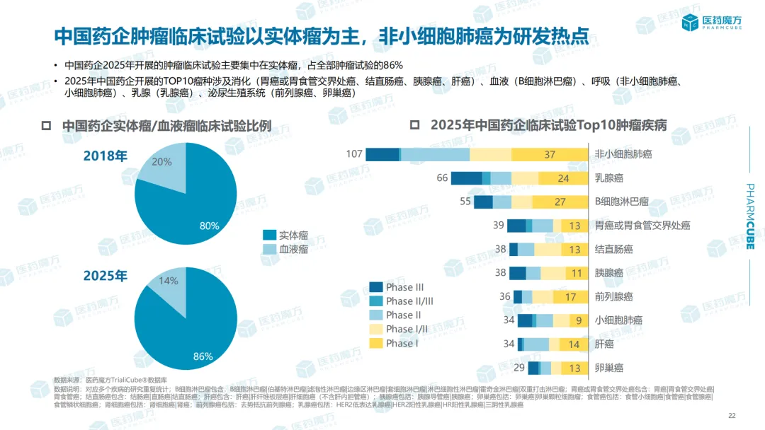2025年,中国药企开展的肿瘤临床试验主要集中在实体瘤,占全部肿瘤试验的86%,TOP10瘤种涉及消化(胃癌或胃食管交界处癌、结直肠癌、胰腺癌、肝癌)、血液(B细胞淋巴瘤)、呼吸(非小细胞肺癌、小细胞肺癌)、乳腺(乳腺癌)、泌尿生殖系统(前列腺癌、卵巢癌)等。