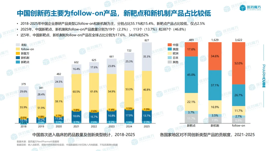 按创新类型看,全球创新药增量主要来自follow-on和新机制产品,整体占比分别为44.6%和20.1%,2025年分别为704款和300款,相较2018年增长41.6%和31.6%。新靶点产品整体占比仅6.6%,且呈下降趋势,2018-2021年约为8%,2023-2025年降至5.6%。中国原研创新药主要为follow-on产品,新靶点和新机制产品占比较低。2018-2025年中国企业原研产品以follow-on和新机制为主,分别占比55.1%和15.4%,新靶点产品占比较低,仅占2.5%。近5年,中国新靶点、新机制和follow-on产品在全球占比分别为17.6%、34.6%和52%。