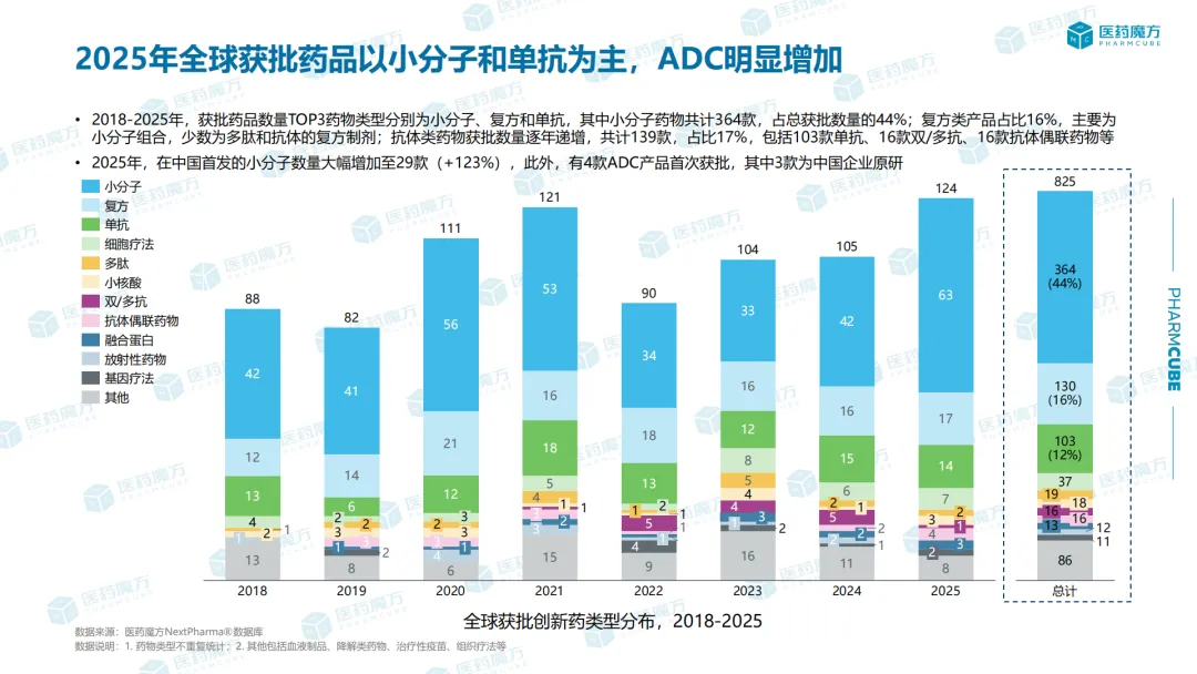2018-2025年,全球获批药品数量TOP3药物类型分别为小分子、复方和单抗,其中小分子药物共计364款,占总获批数量的44%;复方类产品占比16%;抗体类药物获批数量逐年递增,共计139款,占比17%,包括103款单抗、16款双/多抗、16款抗体偶联药物等。2025年,在中国首发的小分子数量大幅增加至29款(+123%),此外,有4款ADC产品首次获批,其中3款为中国企业原研,体现出中国原研产品对全球新药研发的重要贡献。
