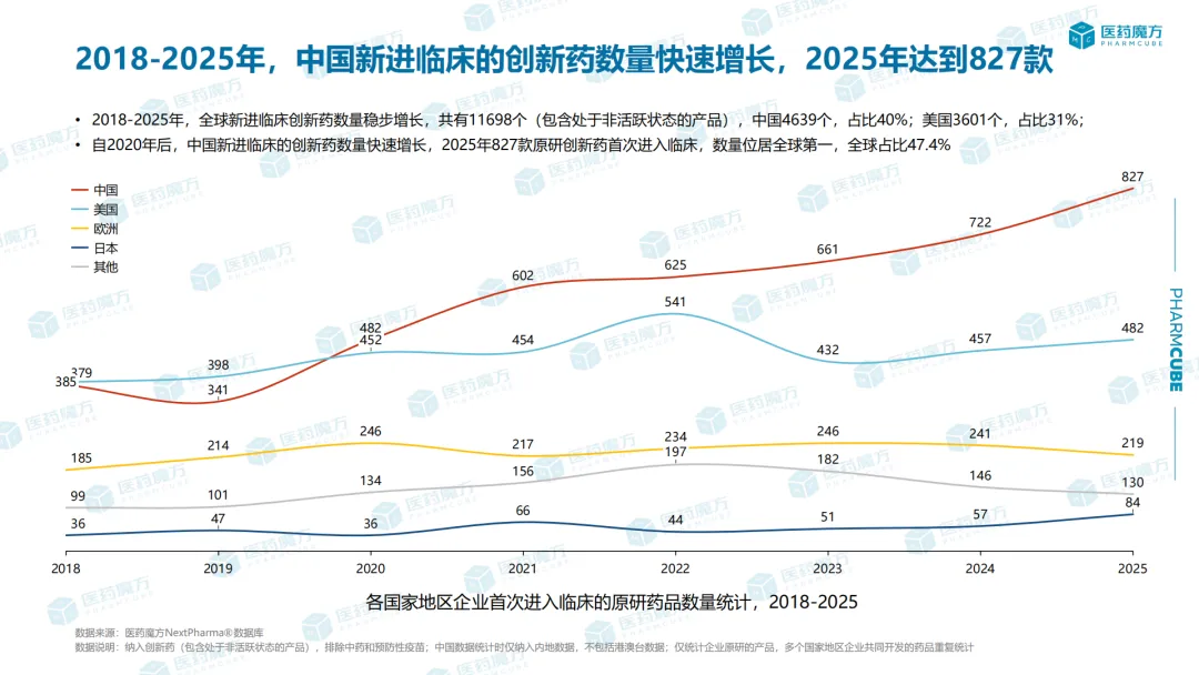 按时间维度统计,2018-2025年期间,全球首次进入临床的创新药数量稳步增长,共有11698个(包含已处于非活跃状态的产品),其中,中国企业原研产品有4639个,占比40%;美国有3601个,占比31%。自2020年起,中国新进临床的创新药数量快速增长,2025年827款原研创新药首次进入临床,数量位居全球第一,全球占比达47.4%,中国已成为全球新药研发的核心地区。