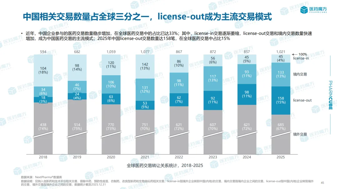 近年,中国企业参与的医药交易数量稳步增加,在全球医药交易中的占比已达33%;其中,license-in交易逐渐萎缩,license-out交易和境内交易数量快速增加,成为中国医药交易的主流模式;2025年中国license-out交易数量达158笔,在全球医药交易中占比15%。