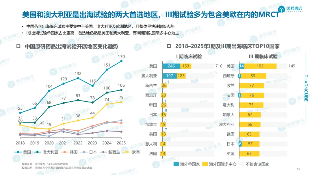 中国原研药出海开展临床试验的数量显著增加,2025年达252项,较2018年增加193%。中国药企出海临床试验主要集中于美国、澳大利亚及欧洲地区,且整体呈快速增长态势,I期出海试验单国家占比更高,首选地仍然是美国和澳大利亚,而III期则以国际多中心为主。