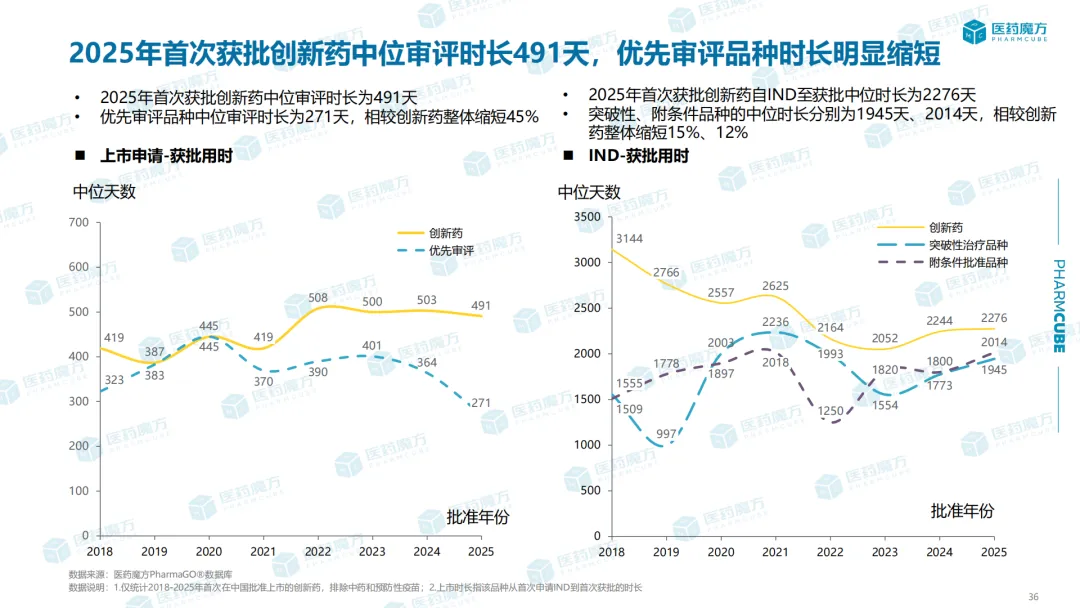 2025年首次获批创新药中位审评时长为491天,优先审评品种中位审评时长为271天,相较创新药整体缩短45%。2025年首次获批创新药自IND至获批中位时长为2276天,其中突破性治疗、附条件批准品种的中位时长分别为1945天、2014天,相较创新药整体缩短15%、12%。