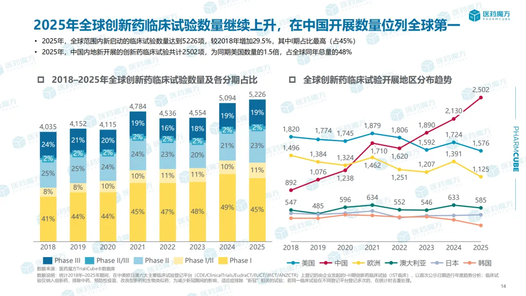 2025年全球创新药临床试验数量(由企业发起的I-III期临床试验)继续上升,达到5226项,较2018年增加29.5%,其中I期占比最高(占45%)。2025年,在中国内地开展的创新药临床试验共计2502项,为同期美国数量的1.5倍,占全球同年总量的48%。