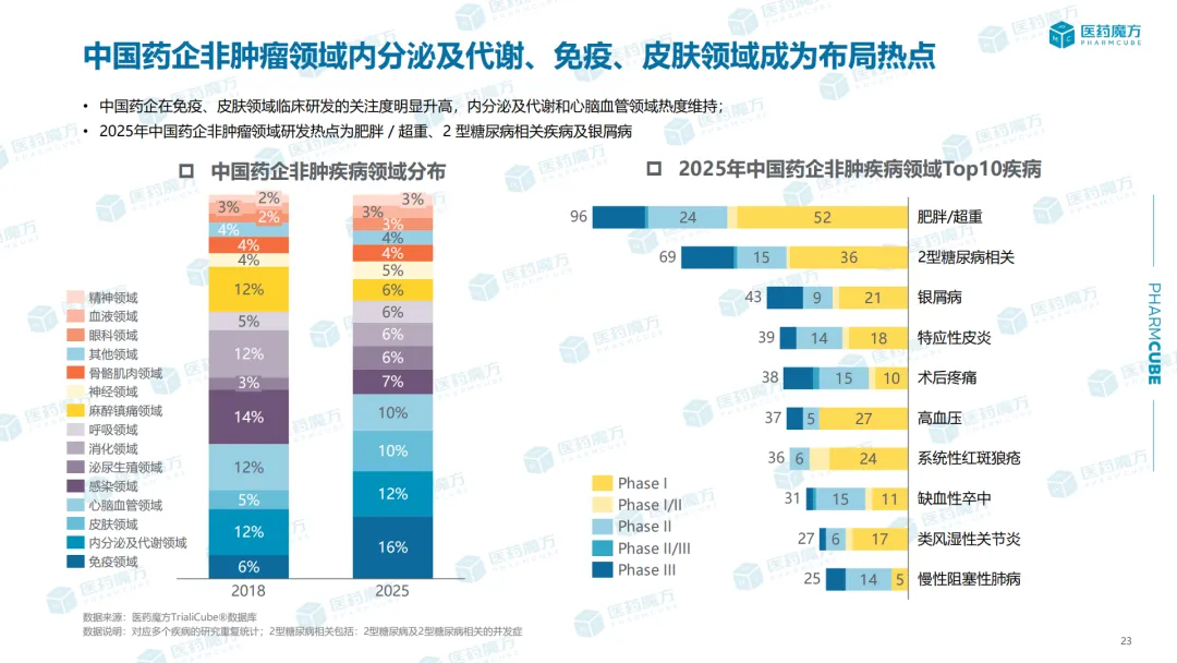 中国药企在免疫、皮肤领域临床研发的关注度明显升高,2025年中国药企非肿瘤领域研发热点为肥胖/超重、2型糖尿病相关疾病,以及银屑病和特异性皮炎等自免领域疾病。