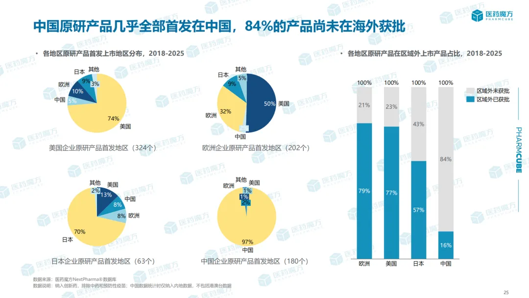不同地区原研产品首发地区的选择具有明显的地域性,中国原研产品几乎全部首发在中国,84%的产品尚未在海外获批,中国原研产品的国际化程度仍然较低。