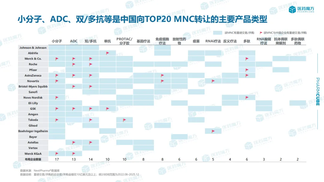 MNC近三年通过重磅医药交易和公司并购获得的资产,小分子、单抗等传统药物仍是各个企业布局的重点类型,新兴疗法中ADC、双/多抗是主要类型,此外PROTAC/分子胶、基因疗法、免疫细胞疗法布局企业较多。MNC从中国引进的项目主要为小分子、ADC、双/多抗。
