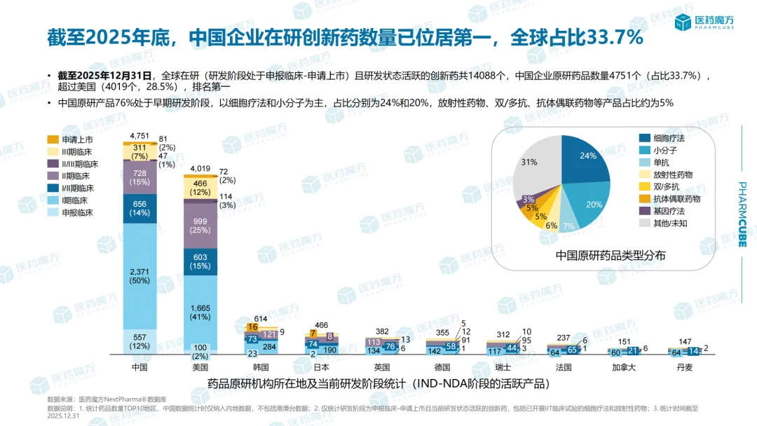 截至2025年底,全球在研(研发阶段处于申报临床-申请上市)且研发状态活跃的创新药共14088个,其中,中国企业原研药品数量4751个(占比33.7%),超过美国(4019个,28.5%),排名第一。中国原研产品中有76%处于早期研发阶段(II期临床以前),在研产品以细胞疗法和小分子为主,占比分别为24%和20%,放射性药物、双/多抗、抗体偶联药物等新兴疗法占比约为5%,数量增长迅速。