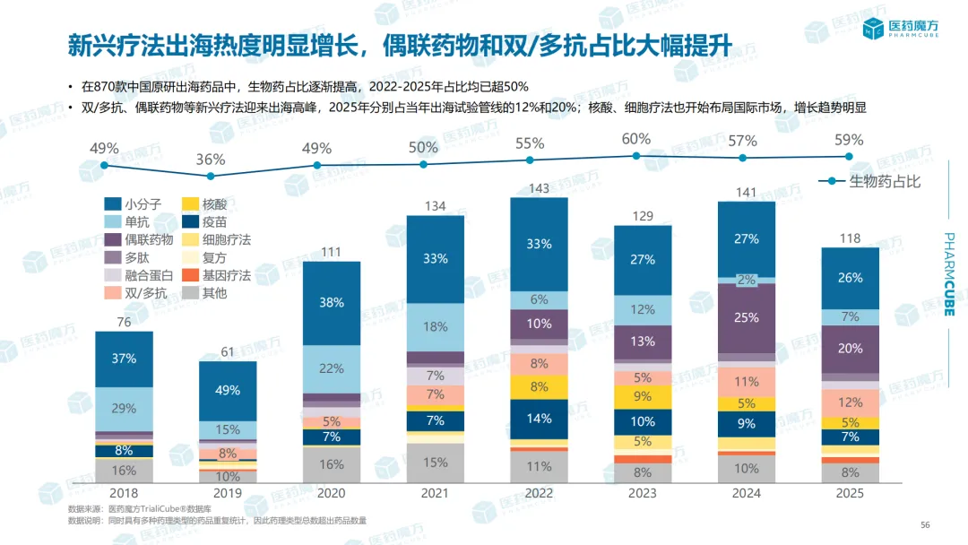 新兴疗法出海热度明显增长,偶联药物和双/多抗占比大幅提升。在870款中国原研出海药品中,小分子产品逐渐降至26%,而生物药占比逐渐提高,2022-2025年占比均已超50%。双/多抗、偶联药物等新兴疗法迎来出海高峰,2025年分别占当年出海试验管线的12%和20%;核酸、细胞疗法也开始布局国际市场,增长趋势明显。