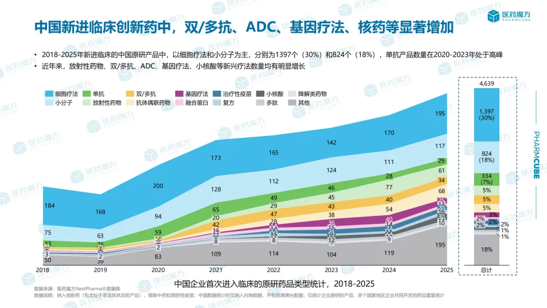 2018-2025年新进临床的中国原研产品中,以细胞疗法和小分子为主,分别为1397个(30%)和824个(18%),单抗产品数量在2020-2023年处于高峰,每年新进临床产品数量约50个,近两年有所降低。而放射性药物、双/多抗、ADC、基因疗法、小核酸等新兴疗法数量近年新进临床产品数量均有明显增长,体现出中国企业新兴产品开发的能力已有显著进步。