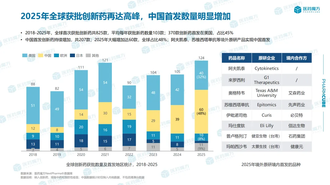 2025年全球获批创新药达到高峰,在中国首发的创新药数量明显增加。2018-2025年,全球首次获批创新药共825款,平均每年获批新药数量103款;370款创新药首发在美国,占比45%。在中国首发的创新药持续增加,共207款;2025年大幅增加至60款,全球占比达48%,主要为国产品种,此外,阿夫凯泰、苏维西塔单抗等境外原研产品实现中国首发,体现出中国药品研发效率和审评审批效率的改善。