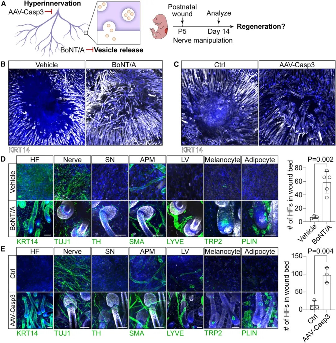 机制研究表明,出生后伤口中的PWF通过大量分泌CXCL12,异常吸引并促进了神经纤维向伤口床的过度生长。这种密集的、新生的神经支配并非简单的伴随现象,而是直接抑制了毛囊等结构再生程序的关键路障。