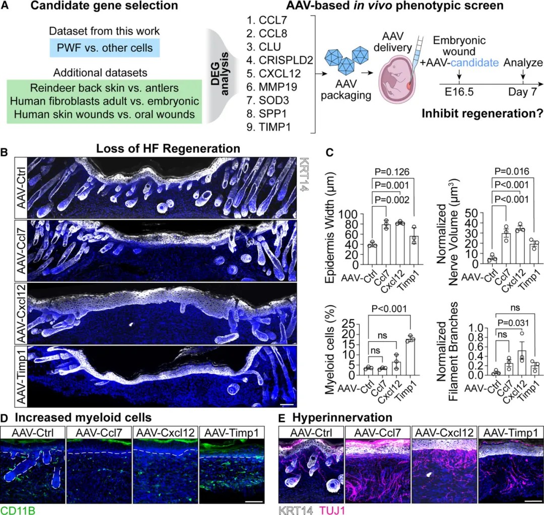 利用新型体内筛选技术,研究人员从PWF富集的因子中鉴定出三个关键基因:TIMP1、CXCL12和CCL7。在胚胎伤口中单独过表达其中任何一个,都会完全阻断多谱系再生,并诱导出与出生后伤口相似的过度神经支配表型。其中,CXCL12 的作用最为突出。