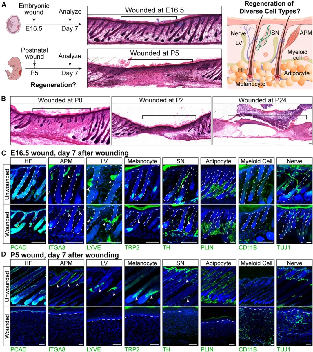 研究团队发现,胚胎期(E16.5)的小鼠皮肤拥有惊人的全能力量。在其遭受全层损伤后,不仅能完美愈合而不留疤痕,更能从头再生出包含毛囊、立毛肌、血管、神经、黑色素细胞和脂肪细胞在内的全部皮肤组件,甚至能恢复“鸡皮疙瘩”这样的复杂反射功能。