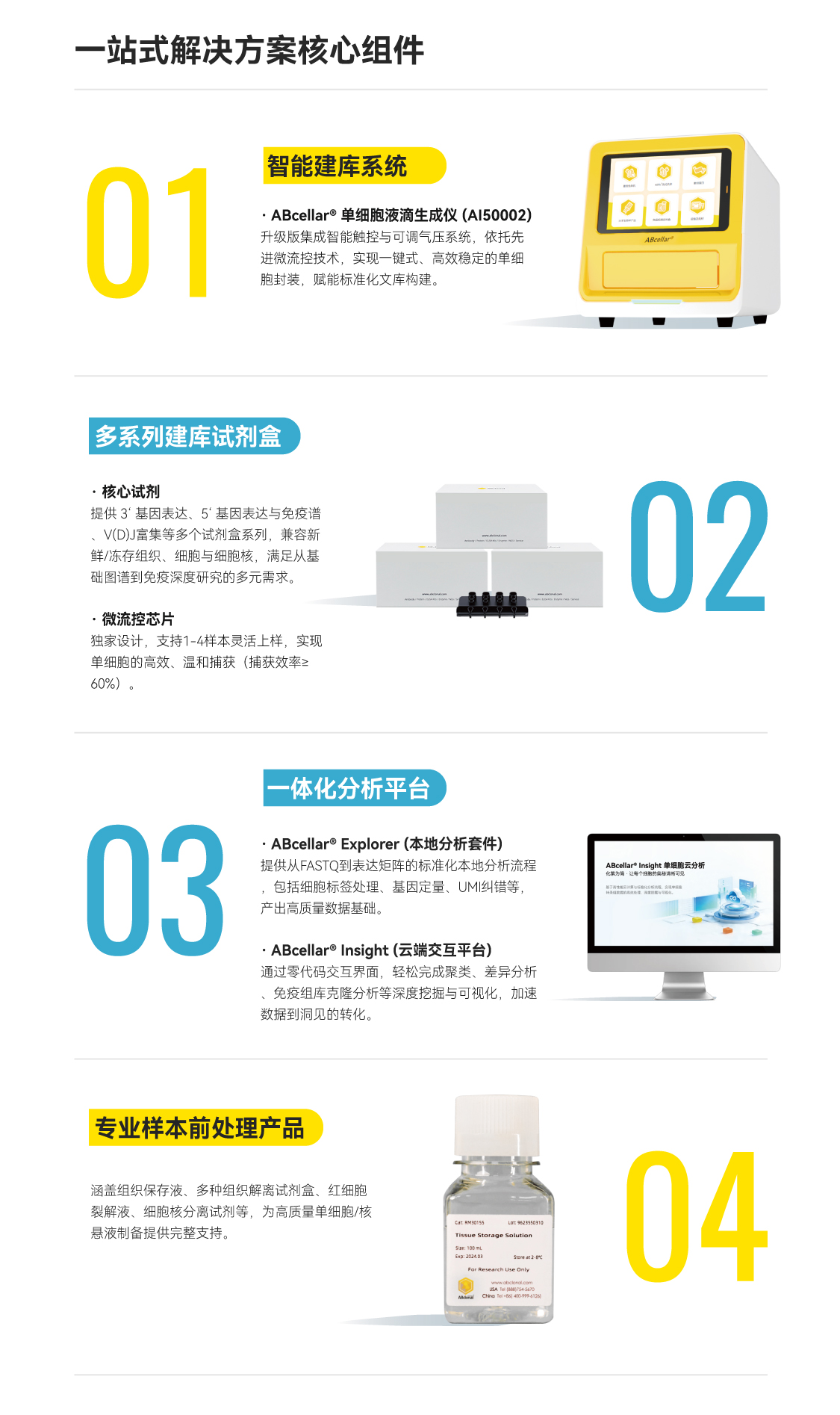 经过15年发展,爱博泰克已构建起覆盖分子生物学、抗体平台、蛋白平台和单细胞测序的完整产品线。ABcellar®单细胞多组学平台自推出以来,持续迭代升级,现已形成涵盖3’ scRNA-seq、5’ scRNA-seq、免疫组库扩增试剂、配套芯片、单细胞建库系统及分析软件的完整产品矩阵。ABcellar®自有平台以“自主可控、性能卓越”为核心优势,致力于为国内科研用户提供国产替代的最佳选择。其中,3’ V4试剂盒作为升级版本,在基因检出数、细胞捕获率等关键指标上表现优异;5’ scRNA-seq联合免疫组库扩增方案,可同时获取基因表达与免疫受体克隆信息,特别适合免疫学研究场景。配套的单细胞建库系统和液滴包裹仪,为实验室自建平台提供了稳定可靠的硬件支撑。通过持续的技术深耕,公司构建了覆盖多技术路径、多应用场景的完整技术体系,打造了从样本处理、实验检测到数据分析的全链条科研服务能力,为众多科研机构、高校及药企提供了专业、高效的技术解决方案,持续助力科研工作者攻克技术难题,加速科研成果从实验室走向产业应用。