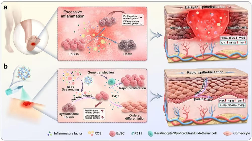 这种兼具微环境重塑与表皮干细胞功能激活的纳米疗法,在糖尿病模型和感染模型中均能加速再上皮化进程与伤口闭合,为实现慢性伤口持久、高效愈合提供了全新思路。