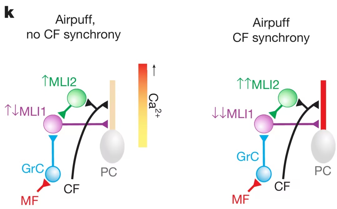 相比之下,与学习相关的感官刺激会产生更复杂的反应,促使攀缘纤维和颗粒细胞的输入趋于一致,这些输入可能激活也可能抑制 MLI1。当 CF 同步活跃时,这种平衡会明显向抑制 MLI1 的方向倾斜,从而提升 PC 树突的钙信号,这对于长期抑制至关重要。