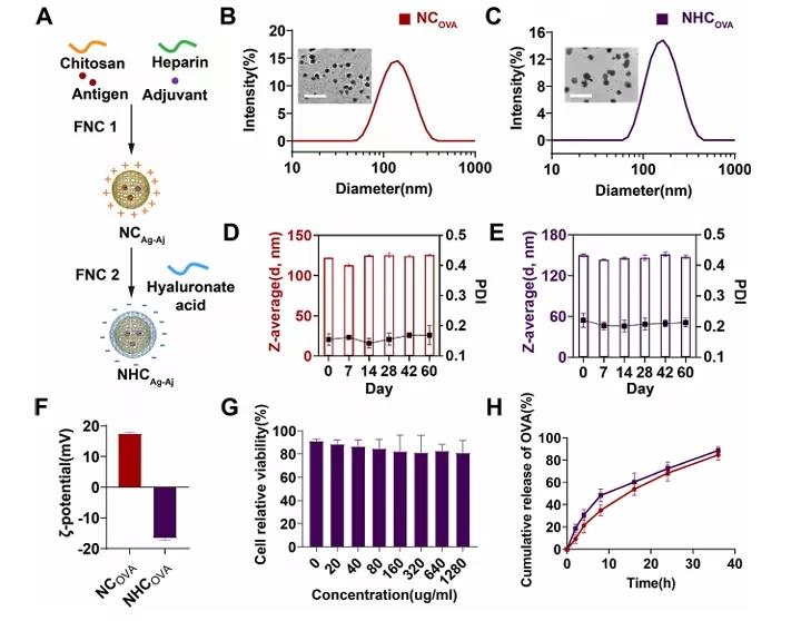 研究团队采用闪速纳米复合技术,以带正电的壳聚糖包裹抗原和佐剂形成内核,再在外层包被亲水性的透明质酸。这种设计使纳米颗粒的表面电荷由正转负,从而避免与带负电的黏蛋白发生静电吸附而被困在黏液层。透射电镜显示颗粒呈均匀球形,粒径约150 nm,在4℃储存60天仍保持稳定,且无明显细胞毒性。体外释放实验表明抗原可在36小时内持续释放,满足免疫递送需求。