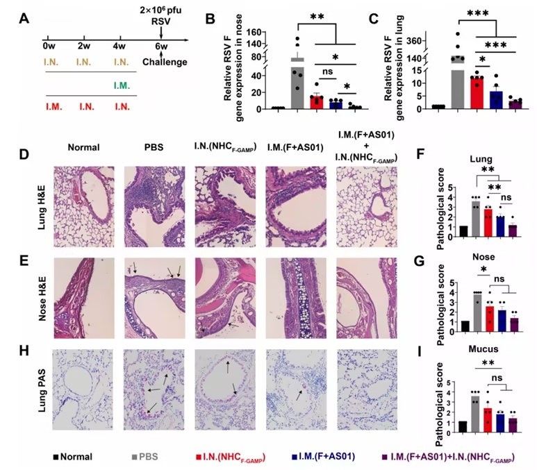 在RSV攻毒保护实验中,接受透明质酸包被cGAMP纳米疫苗免疫的小鼠,鼻腔和肺部的病毒载量均显著低于未免疫组。鼻腔病毒载量水平与肌肉注射AS01佐剂pre-F蛋白的已上市疫苗相当,但肺部病毒清除效果略逊于肌肉注射组。值得注意的是,采用肌肉注射初免(pre-F+AS01)联合鼻腔纳米疫苗加强的策略,小鼠鼻腔和肺部的病毒载量均进一步降低,组织病理学观察显示肺部及鼻腔几乎无炎症细胞浸润和黏液分泌,实现了接近完全的保护效果。