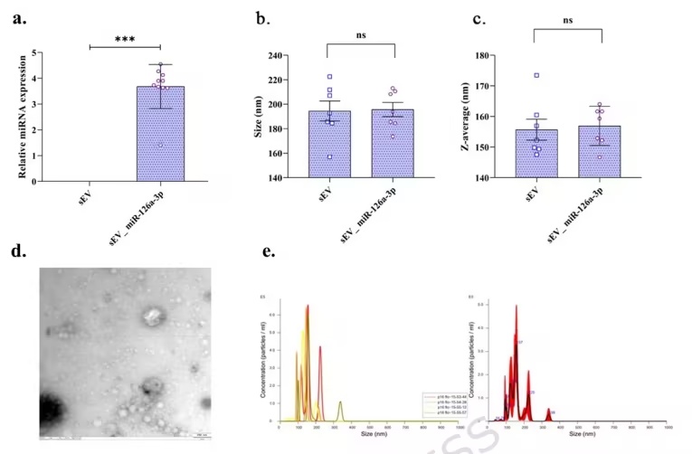 随后,他们采用 0.2% 皂苷温和破膜法,将合成的 miR-126-3p 模拟物高效 “装进” 囊泡,RT-qPCR 检测证实,装载后囊泡内 miR-126-3p 水平显著升高,且 RNase 保护实验表明,大部分 miRNA 被包裹在囊泡内部而非吸附在表面,避免了被体液中核酸酶降解的风险。