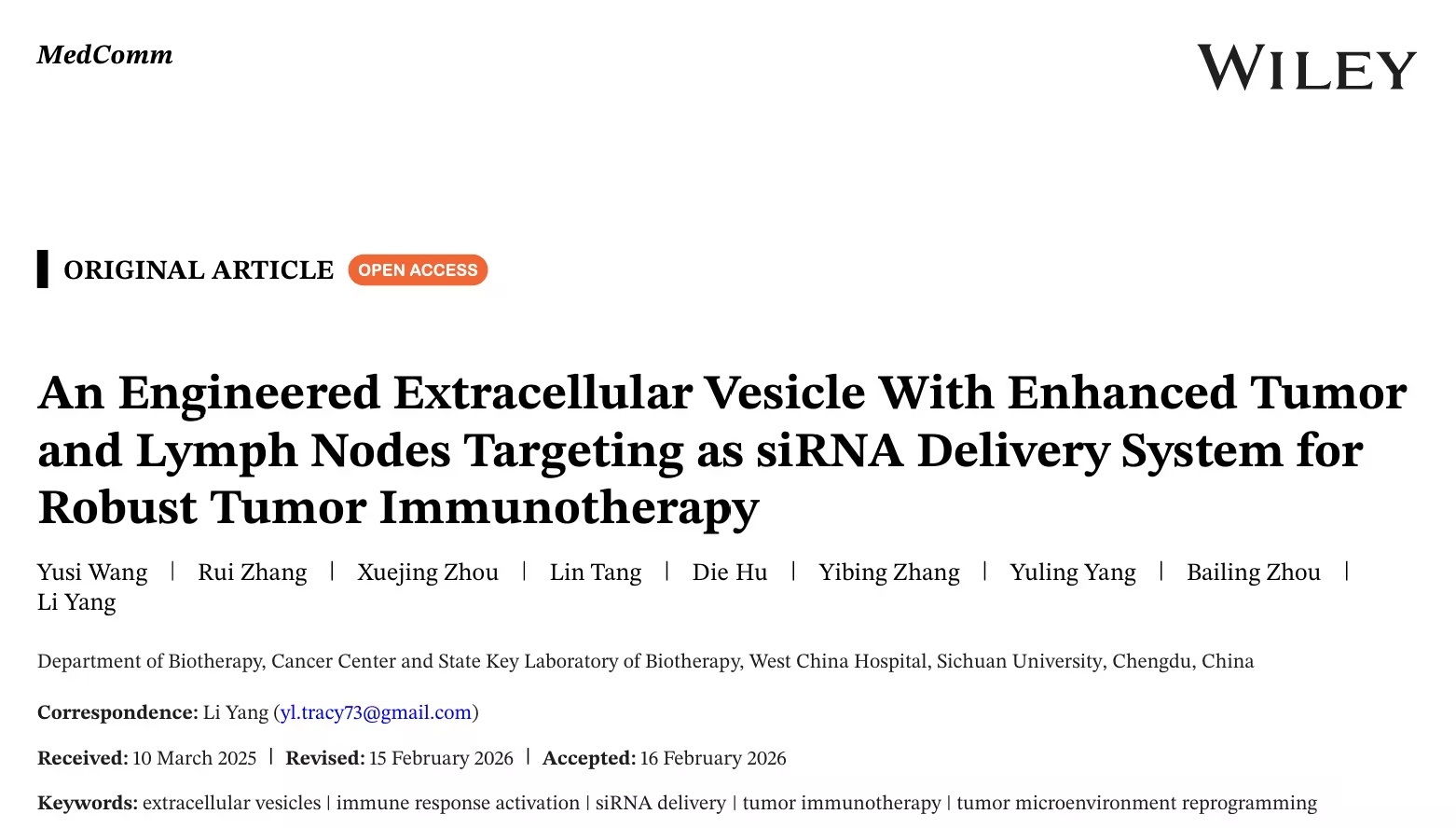 Wang Y, Zhang R, Zhou X, et al. An Engineered Extracellular Vesicle With Enhanced Tumor and Lymph Nodes Targeting as siRNA Delivery System for Robust Tumor Immunotherapy.