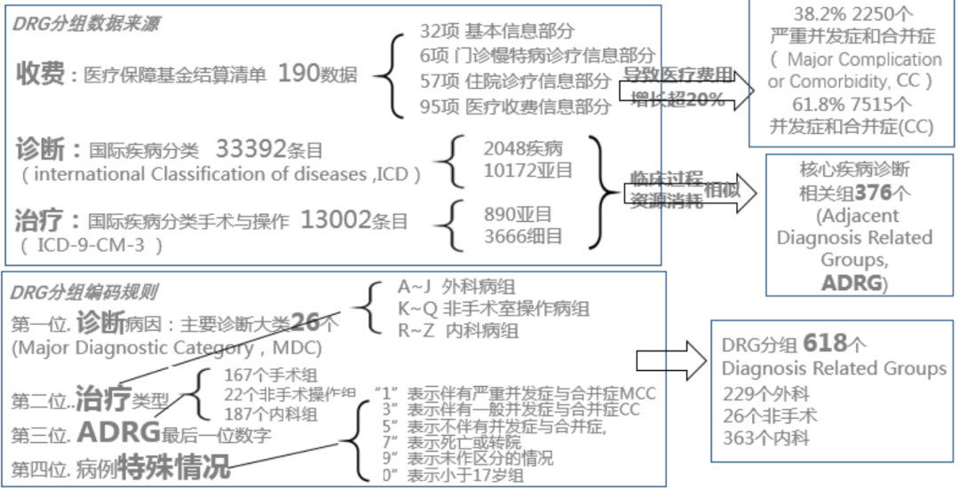 2021年,国家医保局发布DRG1.1版,按DRG1.0版编码规则,形成核心分组(ADRG)和细分组(DRG)为376组和628组,要求在各地设定权重和费率并真实付费。2024年,发布DRG2.0版,仍按DRG1.0版编码规则,形成核心分组(ADRG)和细分组(DRG)为409组和634组,还规定了「因住院时间长、医疗费用高、病情复杂危重、使用新技术新药械或多学科联合诊疗的特殊病例,按占医院DRG结算总病例数2-4%的比例,作为特例单议处理」。