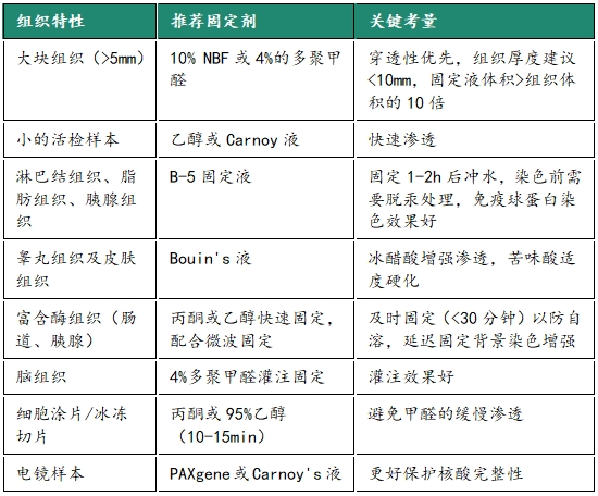 理想的固定剂能够完整保存组织和细胞的形态结构、尽可能减少抗原空间构象和免疫活性的改变、稳定维持分子间的相互作用。但是,迄今为止还没有一种固定剂能满足以上要求,包括福尔马林。因此,需要研究人员不断进行反复实验,在维持组织完整性和抗原免疫反应性之间找到精妙的平衡。