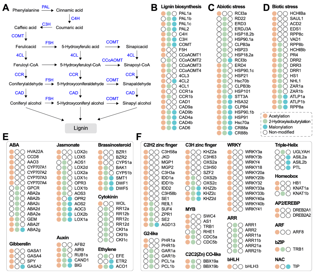 图6. Kac-、Khib-和Kla-修饰蛋白在木质素生物合成、非生物和生物胁迫、激素代谢以及转录因子中发挥作用
