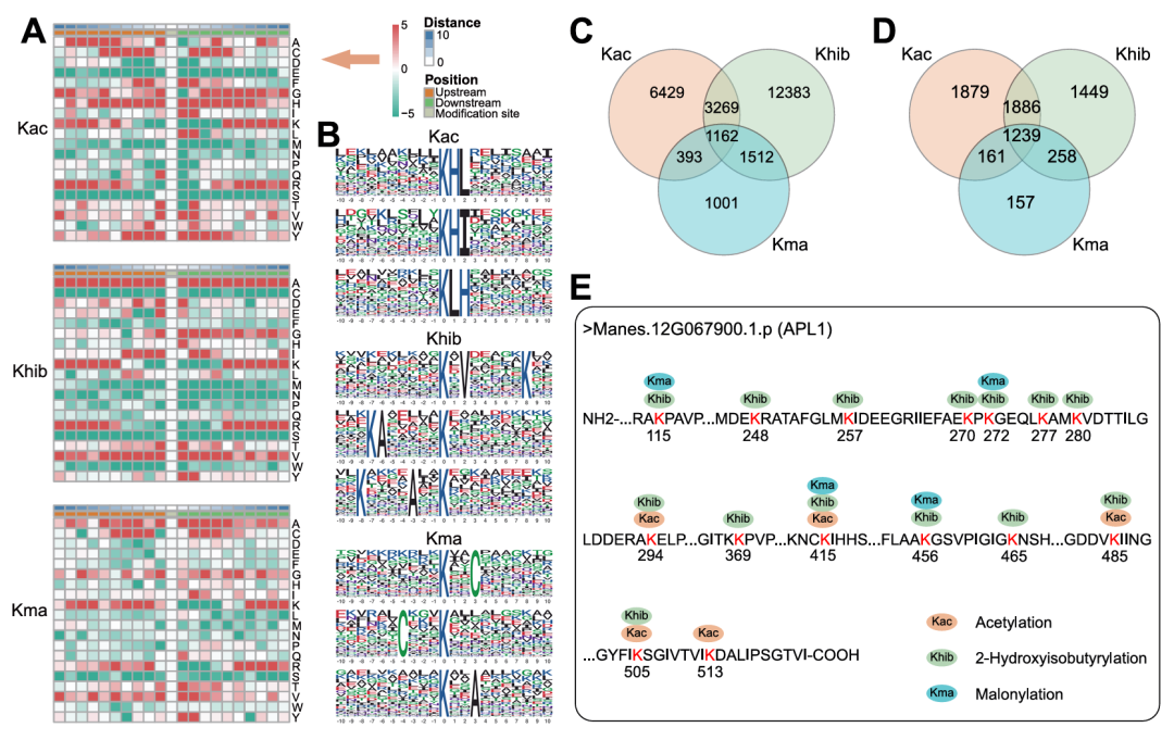 基于上述修饰特征,研究还分析了Kac、Khib和Kma修饰的重叠性(图2C-E),以明确这些修饰是否会共发生在同一赖氨酸位点或同一蛋白上。结果显示,1239个蛋白、1162个位点同时存在三类修饰,Kac与Khib的共修饰蛋白数(1886个)远高于Kac-Kma、Khib-Kma组合;单一修饰分析发现,仅Kac、Khib修饰的蛋白数远多于Kma,表明前两者的调控范围更广。其中,淀粉积累关键蛋白APL1为三类修饰共现的典型,其含有5个Kac、14个Khib、4个Kma位点,且K415为三类修饰的共同位点(图2E)。由此可见,木薯中单个赖氨酸残基可以经历多种PTMs,这可能使得蛋白质功能能够进行协调调控。