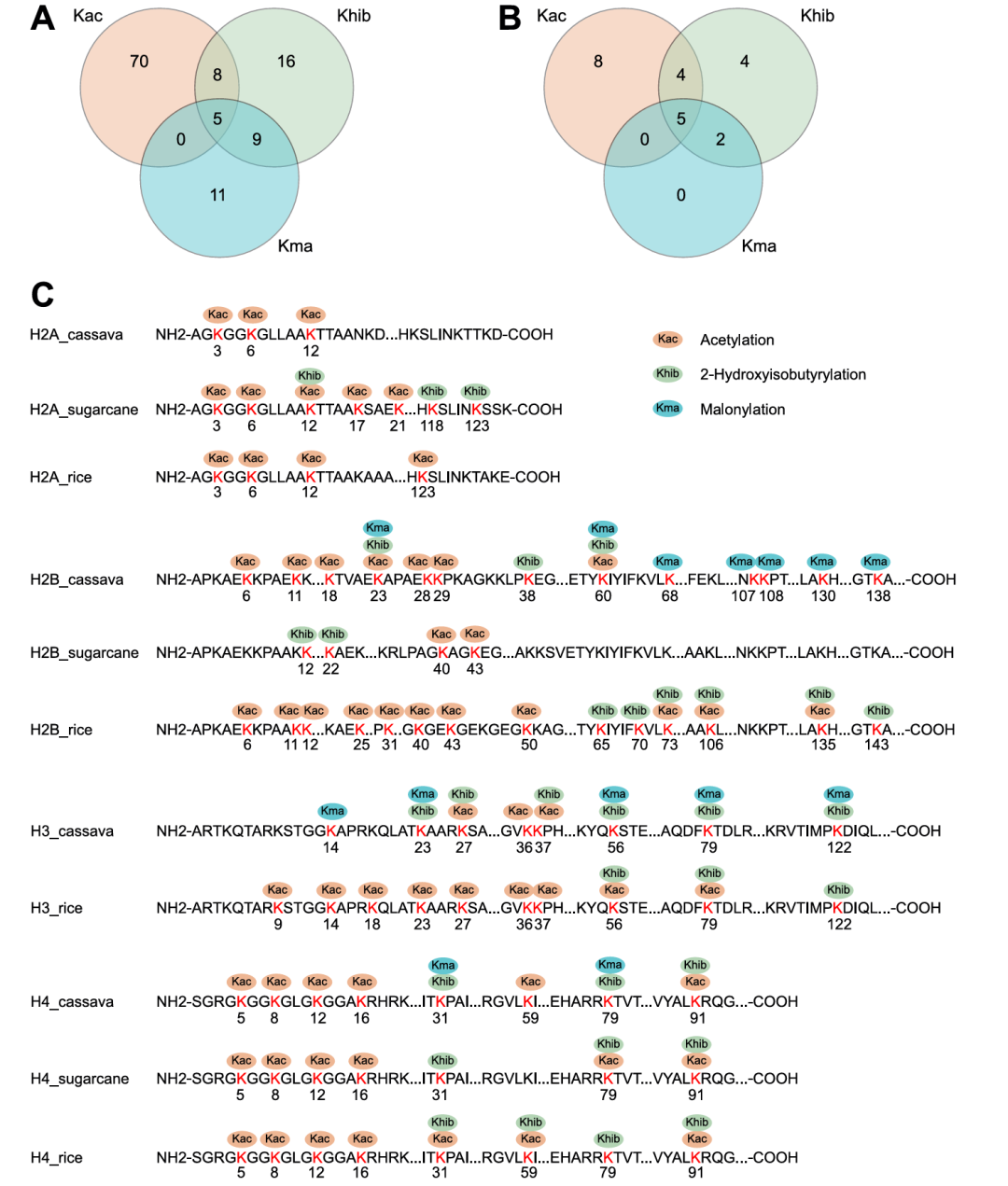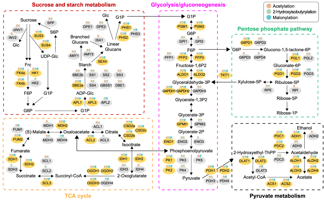 蔗糖和淀粉代谢对木薯块根的生长发育及淀粉积累至关重要。聚焦Kac、Khib、Kma修饰对木薯蔗糖和淀粉代谢的调控作用,研究总计鉴定出29个相关修饰蛋白,覆盖蔗糖降解、淀粉合成与降解全流程(图5)。其中,11个核心蛋白(5个蔗糖降解、3个淀粉合成、3个淀粉降解相关)同时发生三类修饰,13个蛋白受Kac和Khib协同修饰,仅3个蛋白为单一修饰。结果而言,Kac与Khib在该代谢通路中协同调控作用显著,三类修饰共同构成了广泛且精密的调控网络,为木薯块根淀粉积累提供了重要的翻译后修饰层面调控基础。
