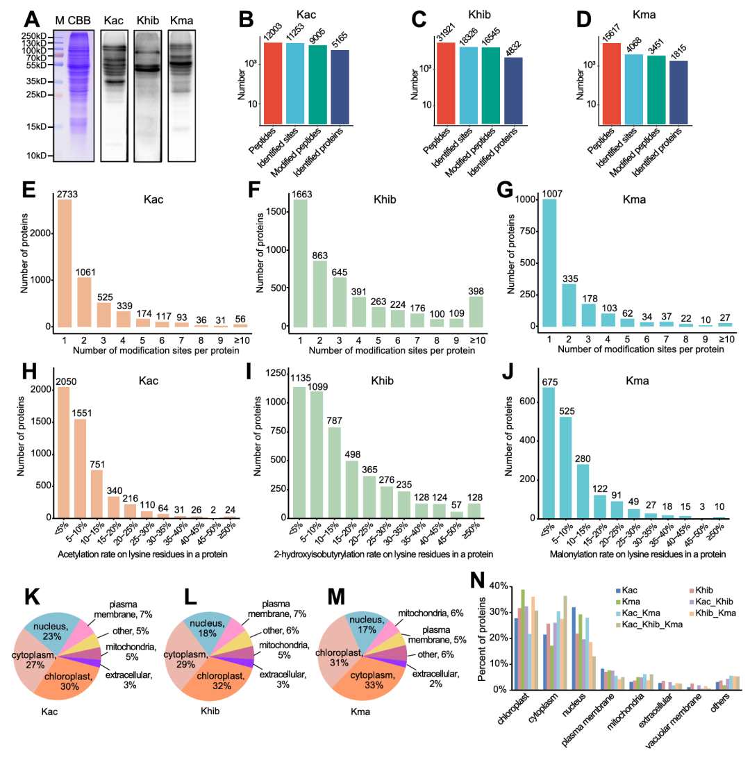 研究以发育中的木薯块根为实验材料,通过免疫印迹与质谱分析,明确了Kac、Khib、Kma为木薯中独立且广泛存在的蛋白修饰系统(图1A),并且完成了三类修饰的全局鉴定(图1B-D)。在修饰位点与蛋白分布上,Khib修饰位点数量最多,且其蛋白中高修饰位点数占比显著高于Kac和Kma,三类修饰蛋白均以少于5个修饰位点为主(图1E-G);修饰频率方面,三类蛋白均以低频率修饰为主,Khib蛋白出现高频率修饰的数量最多(图1H-J);对于亚细胞定位,三类修饰蛋白均主要分布在叶绿体、细胞质和细胞核,而同时含三种修饰的蛋白则以细胞质定位为主(图1K-N)。
