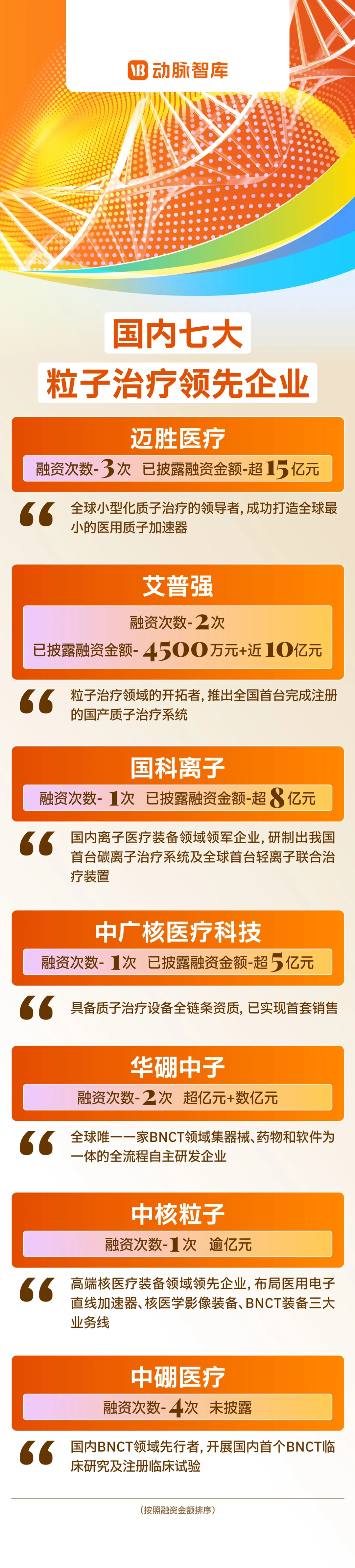 动脉网根据粒子治疗领域企业融资情况,梳理出了国内领先的七大粒子治疗企业: