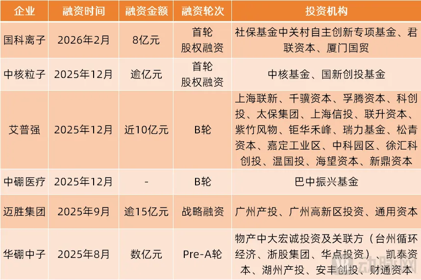 粒子治疗是一种利用高能粒子精准杀伤肿瘤的放疗技术,包含质子放疗、碳离子放疗、硼中子放疗等。近半年,粒子治疗领域频现大额融资,如国科离子募资8亿元、艾普强完成近10亿元B轮融资,迈胜集团完成15亿元战略融资,华硼中子、中核粒子完成亿元级融资,融资金额合计超30亿元。