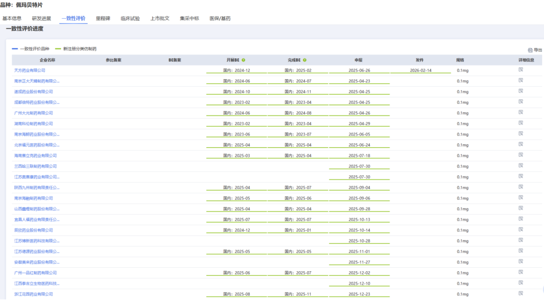 这场“闪电战”式的布局,并非国内药企的临时起意,而是长期蓄势待发与精准战略布局的结果。早在2022年,已有多家企业提前启动佩玛贝特片的生物等效性(BE)试验,潜心打磨技术、完善试验数据,静待原研药在华获批的“发令枪”。截至目前,已有超20家药企递交了佩玛贝特片4类仿制上市申请,头部药企与新锐企业同台竞技,首仿之争的激烈程度可见一斑。