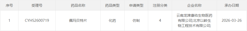 今日(3月26日),据CDE官网最新公示:云南龙津康佑生物医药有限公司与北京以岭生物工程技术有限公司联合申报的佩玛贝特片(4类仿制药)上市申请已获受理。这标志着又一企业强势入局佩玛贝特首仿争夺战,让这场本就激烈的市场角逐更趋白热化。