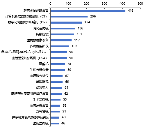 从产品类别来看,2025年全国设备招标公告覆盖品种共350种。采购频率最高的五类产品分别是:超声、CT、DR、消化道内镜和胸腹腔镜。其中超声设备项目数断层领先,共计416个;其次是CT设备206个。