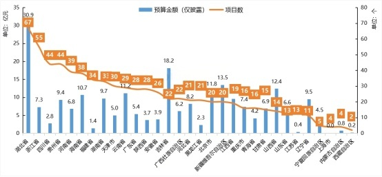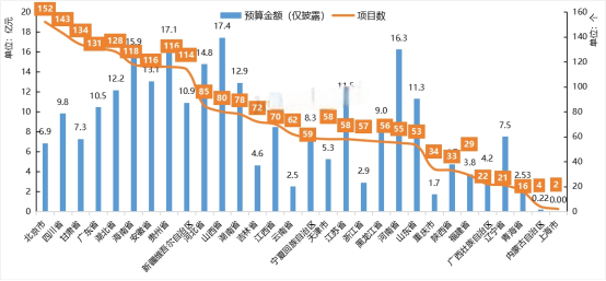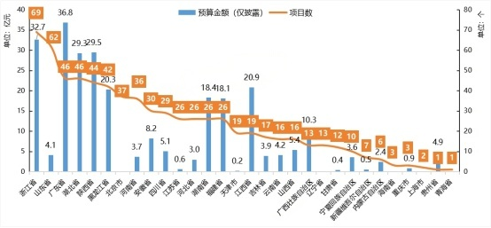 从省份分布看,2025年全国共有30个省/直辖市/自治区开展了医疗设备更新项目,共计703个项目,其中浙江、广东在项目数与预算规模上领跑全国,山东、湖北、陕西和黑龙江项目数也均在40个以上。