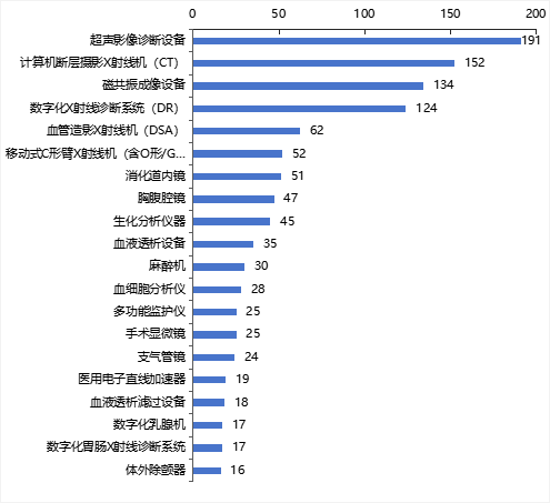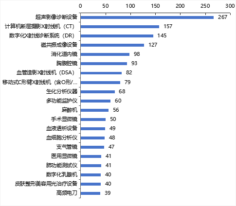 从产品类别来看,2025年全国设备采购意向覆盖品种共322种。其中影像类设备需求最为突出,超声影像诊断设备以267个项目位居首位,CT、DR、MR项目数均超120个;同时消化道内镜、胸腹腔镜、生化分析仪器等品类项目数也相对较高。