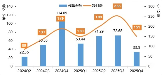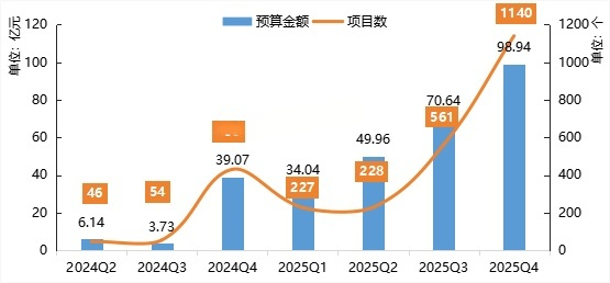 截至2025年底,我国医疗领域设备更新拟建项目数量共计2197个,其中1152个项目披露了预算金额,占比约52.4%,披露总预算金额约946亿元,单个项目平均预算金额约8210万元。