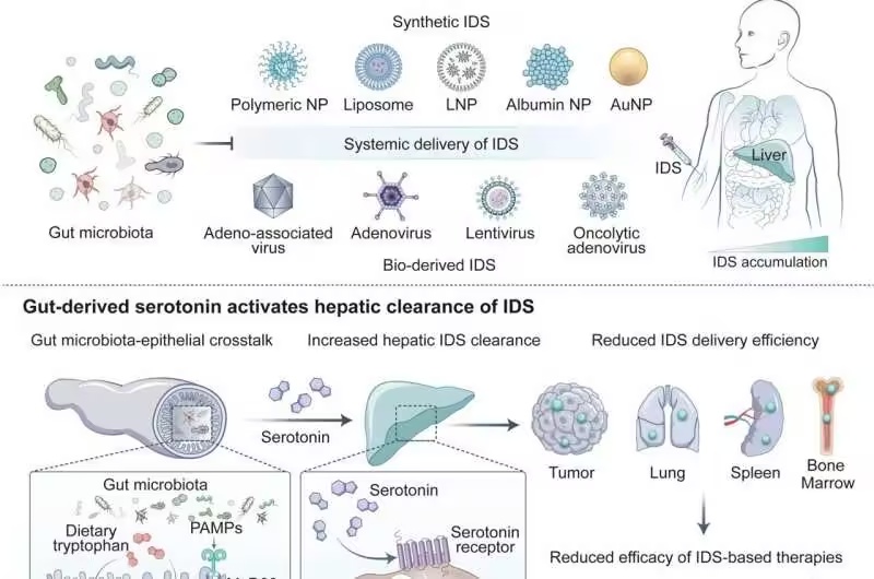 Researchers uncover gut-liver serotonin pathway that limits nanoparticle and viral delivery