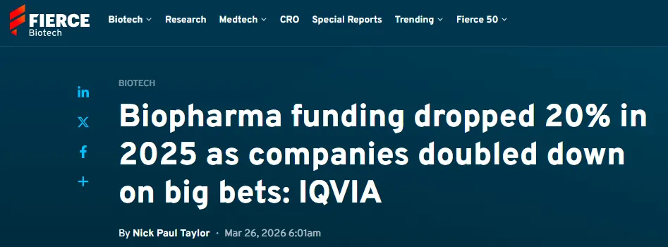 Biotech报道称,IQVIA发布的最新报告显示,2025年全球生物制药行业融资总额同比下降20%,从2024年的1020亿美元回落至820亿美元;全球IPO募资规模仅30亿美元,创下近十年最低记录。