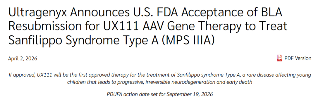 2026年4月2日,Ultragenyx宣布其针对黏多糖贮积症ⅢA型(MPS ⅢA)的AAV基因疗法UX111(rebisufligene etisparvovec)的生物制品许可申请(BLA)已重新获得美国FDA受理,PDUFA目标行动日期定为2026年9月19日。若顺利获批,UX111将成为全球首个用于治疗MPS ⅢA的上市疗法。