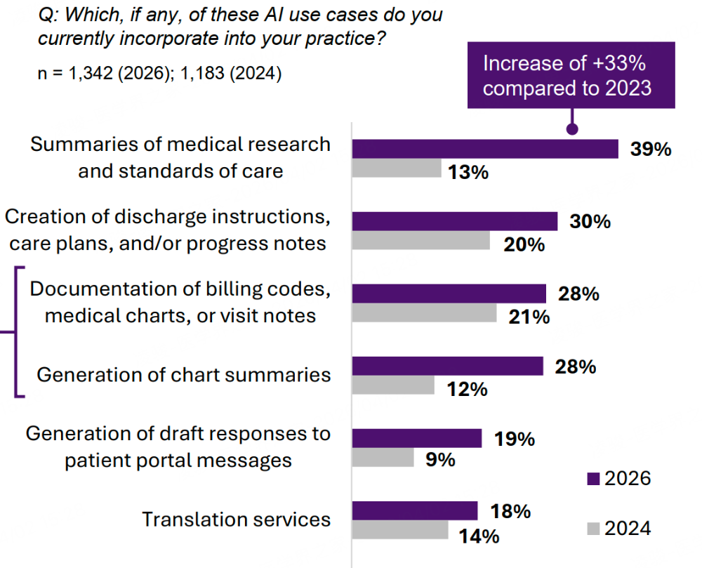 从帮医生写病历、做摘要,到辅助诊断、预测患者风险,过去几年间,AI正以一种几乎不可逆态势渗入整个医疗行业,科技巨头和创业公司争相涌入。但医生们自己怎么看?多少人开始使用,又在担心什么?近日,美国医学会(AMA)发布了《2026年医生增强智能调查》,这是AMA自2024年以来开展的第三轮同类调查,共覆盖1692名不同专科、不同执业环境和职业阶段的美国医生。结果显示,2026年,超过80%的受访医生表示已在执业中使用AI,这较2024年翻了一倍,医生们平均使用的AI应用场景,也从2024年的1.1个增长到了2.3个。尽管使用率持续攀升、认知度不断提高,但医生们对AI的态度远非一片乐观。40%的受访者表示自己对AI“既兴奋又担忧”,围绕“被取代”和法律责任归属的焦虑,依然存在于医生群体之中。项目计划、病历等文书撰写工作,无疑是最令医生们感到头疼的活。调查报告显示,从具体使用场景来看,文档类和摘要类应用,是目前美国医生使用最多、也最感兴趣的AI工具。2026年,已有近40%的医生已经将“医学研究”“诊疗摘要”类AI工具纳入了日常工作流,较2024年提升了26个百分点,成为增长最快的应用方向。此外,出院小结和护理计划(30%)、病历和就诊记录文档(28%)生成等文档相关工作也跻身前列。值得一提的是,尽管只有28%的受访医生开始利用AI辅助病历等文书的撰写,但对这类应用表现出“极大热情”的比例达到57%至58%。这一趋势也印证了医生群体的普遍困境:行政任务繁重且烦琐、文书工作大量挤占诊疗时间。它提示,随着相关AI软件的愈发成熟、可靠,AI病历撰写可能成为下一个爆发增长的领域,医生们已经随时做好了准备。此外,在对AI影响各维度的预期中,医生们最看好的两个方向是工作效率和诊断能力。76%的受访医生认为AI加入患者照护具有积极优势,较2023年的65%持续走高;37%的人表示对AI“更兴奋”而非“更担忧”,这一比例也在过去3年稳步上升。调查中,仅有13%的受访医生担忧AI会导致工作压力增加和职业倦怠。更多人则认为,AI将对医生的工作效率、诊断能力、临床结果等产生积极的影响。超过70%的医生表示,AI能分担一些烦琐的临床和管理工作,帮助自己回归到更能体现医生专业价值的工作中,从而减少职业倦怠感。可以说,在“文书负担”长期困扰美国医生的背景下,AI率先从“最痛”的地方切入,正在赢得越来越多医生的信任,回应了医生们最迫切的需求。然而,在AI快速普及的背后,医生们的焦虑也在清晰浮现。最突出的,就是对技能退化的广泛担忧。今年年初,复旦大学附属华山医院感染科主任张文宏曾在一场会议上提到,拒绝把AI引入医生们的日常生活。张文宏担忧,一名医生若从实习阶段就未经完整的诊断思维训练,直接借助AI获得结论,将导致其无法鉴别AI诊断的正误。这种能力的缺失,是隐藏在技术便利背后的深层隐患。结果显示,88%的受访医生对AI可能导致的专业技能流失表示“不同程度的担心”。其中,仅28%的医生担心自身技能退化,而高达70%的人担忧的则是医学生和住院医师的培养问题。此外,在“担心自身”的医生群体中,年轻执业医师的比例也最高。初级保健医生(34%)也比外科(24%)和内科(25%)的同行们更为焦虑。这表明,大部分人并不认为,一个成熟的高年资医生,会因为AI的普及导致自身医疗水平下降。他们更多担忧的是,当AI一步步渗入整个医学教育体系,改变,甚至重塑传统的医生培养路径,是否会对年轻医生的长期专业发展造成负面影响。值得关注的是,在此次调查中,患者隐私是唯一一个医生们普遍认为“弊大于利”的领域。数据进一步揭示,当AI工具由所在的医疗机构提供时,42%的医生表达了隐私担忧;而当工具来自非机构渠道时,这一比例飙升至71%。在监管和信任层面,《报告》的发现同样值得关注。88%的医生认为,AI工具的安全性和有效性需经权威机构验证,并定期进行监控。86%的人要求,医院和电子健康档案供应商要对AI工具下的患者隐私负责。在七项优先级排序中,“建立清晰的法律责任框架”被最多医生视为第一要务,而“患者提前知晓”则排在最后。换句话说,患者充分的知情同意并不能消除医生的顾虑,真正让医生放心接受AI的,是机构层面的信用背书与责任兜底。30%的医生推测,已有超半数患者在使用AI查询医疗信息,但仅8%的医生表示,有患者主动披露了这一行为。对于患者使用AI的范围,医生们也画出了一条较为清晰的边界:查询药物信息和副作用(68%)、了解一般健康问题(64%)被认为是可接受的,但将近一半的医生明确表示,不希望患者用AI来解读病理报告(49%)或放射影像(46%)。从AMA连续三年的追踪调查可以看出,目前,医生群体正处于一个“拥抱与警惕AI并行”的阶段。AI在文档减负和效率提升方面的价值已获得广泛认可,但在隐私保护、法律责任、技能维持等关键环节,仍需要建立清晰的制度保障和信任机制,才能让医生从“有条件接受”走向“真正放心使用”。