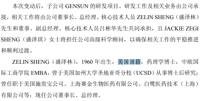 核心技术人员、首席科学官(CSO)盛泽琪(JACKIE ZEGI SHENG),因“个人原因”辞职,不再担任子公司GENSUN董事及CEO,转任公司高级科学顾问。
